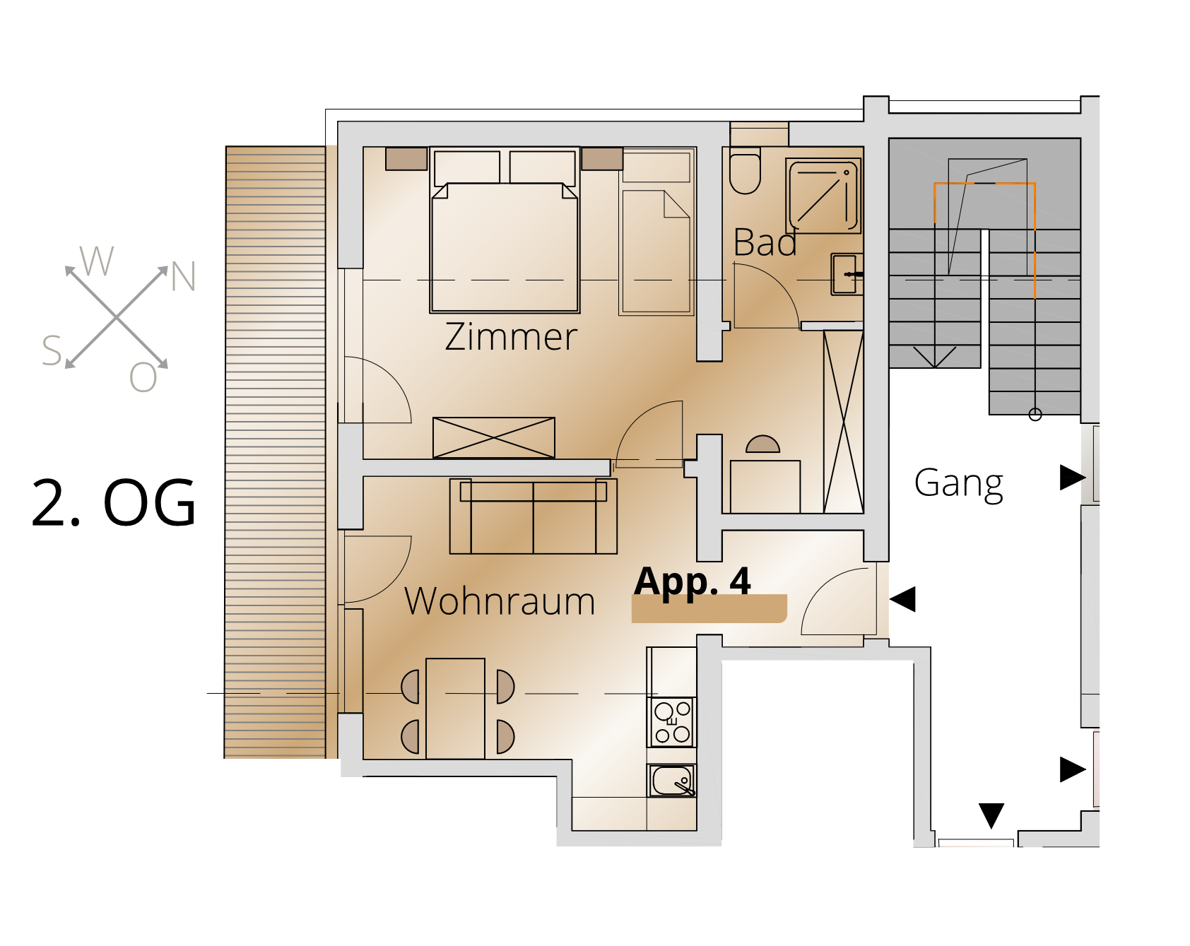 Helles Appartement im 2.OG mit einem Schlafzimmer (Doppelbett 180x200 cm, Zusatzbett 75x200 cm), Wohn-/Esszimmer mit vollausgestatteter, offener Küche (Kühlschrank mit Gefrierfach, Geschirrspüler, Kaffeemaschine, Herd mit 4 Kochfelder, Backofen), modernes Bad mit Dusche und WC, Sat-TV mit Flachbildschirm, kostenloses WLAN, großer Südbalkon.
